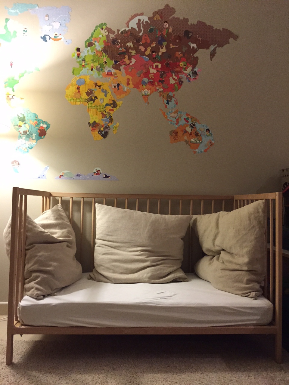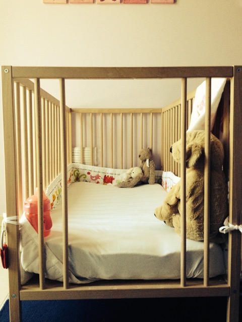 Nous avions scié les barreaux du milieu d’une des extrémités du lit pour que les enfants puissent y entrer et sortir librement, tout en gardant le côté cocoon du lit à barreaux. C’était il y a un an, a quelques jours près…